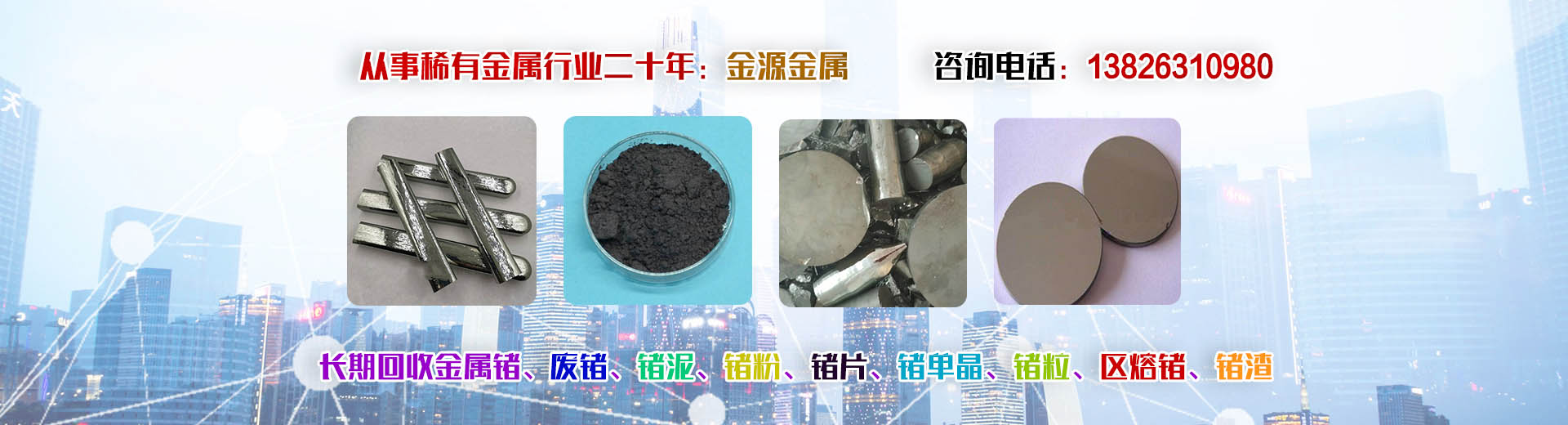 韶關(guān)市金源金屬材料有限公司坐落于中國廣東省韶關(guān)市,長期收購回收銦、精銦、粗銦、銦絲、銦靶材、ITO靶材靶粉、回收金屬鍺、鍺錠、鍺粉、鍺片、回收鍺單晶、單晶鍺、鍺粒、區(qū)熔鍺、工業(yè)鍺、廢鍺、鍺泥、鍺渣、二氧化鍺回收、四氯化鍺、有機鍺、銀、純銀、銀靶材、高價收購回收ITO廢靶、回收廢銦、廢銦沙、廢銦渣、回收粗銦、廢銦絲、廢銦珠、廢銦箔、廢銦棒、收購銀焊條、銀焊絲、導(dǎo)電銀膠、金屬鎵、硝酸鎵、氧化鎵、三氯化鎵、氯化鎵,供應(yīng)及回收氧化鎵、氫氧化鎵、碲化鎵,硒化鎵,銦粉,氧化銦、氯化銦、硫酸銦、硫化銦、醋酸銦、氫氧化銦、硒化銦,碘化銦,銅銦鎵硒,含金、銀、銦、銠、鈀、鎵、鍺等稀有貴金屬材料,稀土金屬材料、氧化鏑、氧化镥、氧化鋱、氧化鐠釹等回收。